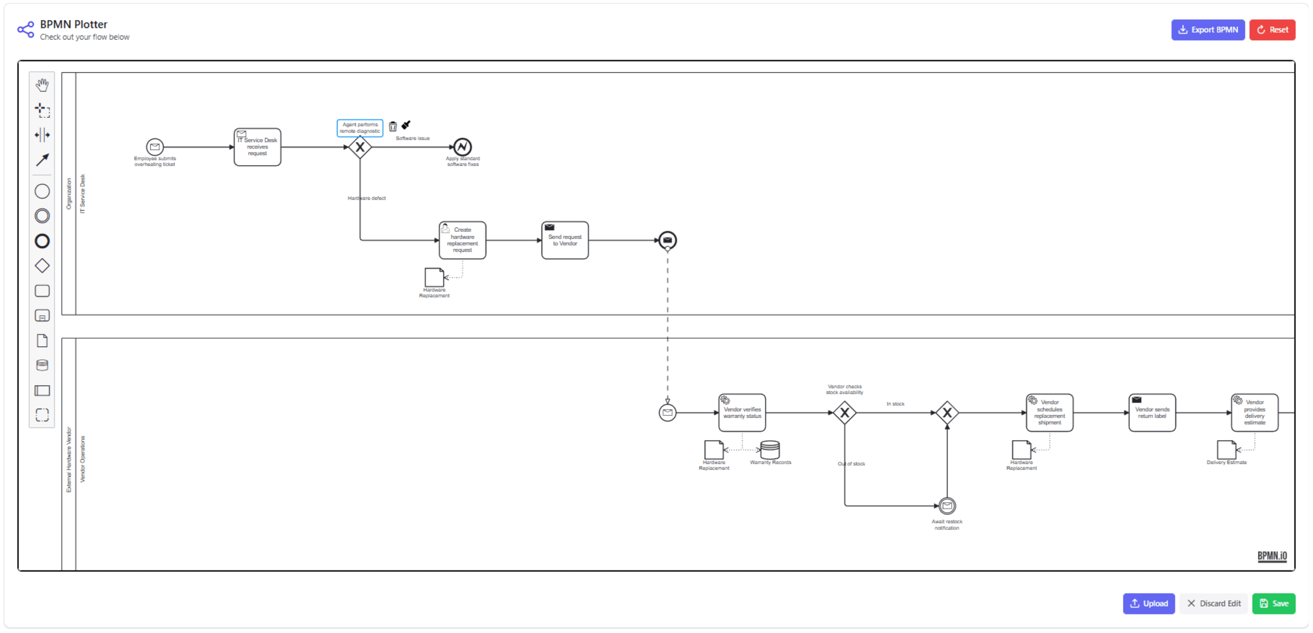 Turn spoken or written input into end-to-end, automatino-ready process maps. Allows you to turn hours of transforming interview notes or 40+ page SOPs into neat, BPMN 2.0 compliant diagrams in seconds.