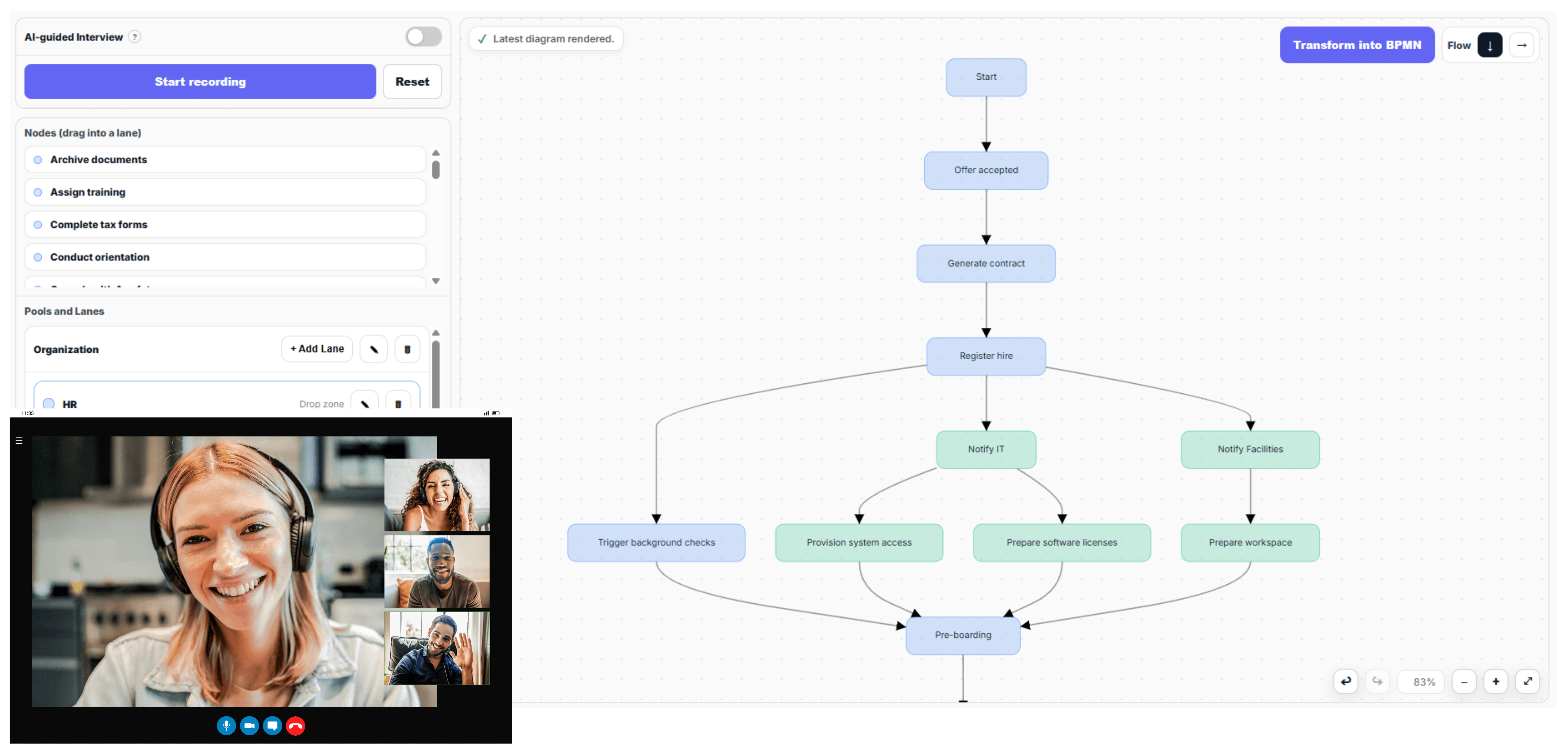 The AI joins your session as a participant. The moment stakeholders start talking, it identifies actors, decision points and flows — structuring everything into a process model in real time, with zero post-session effort required.